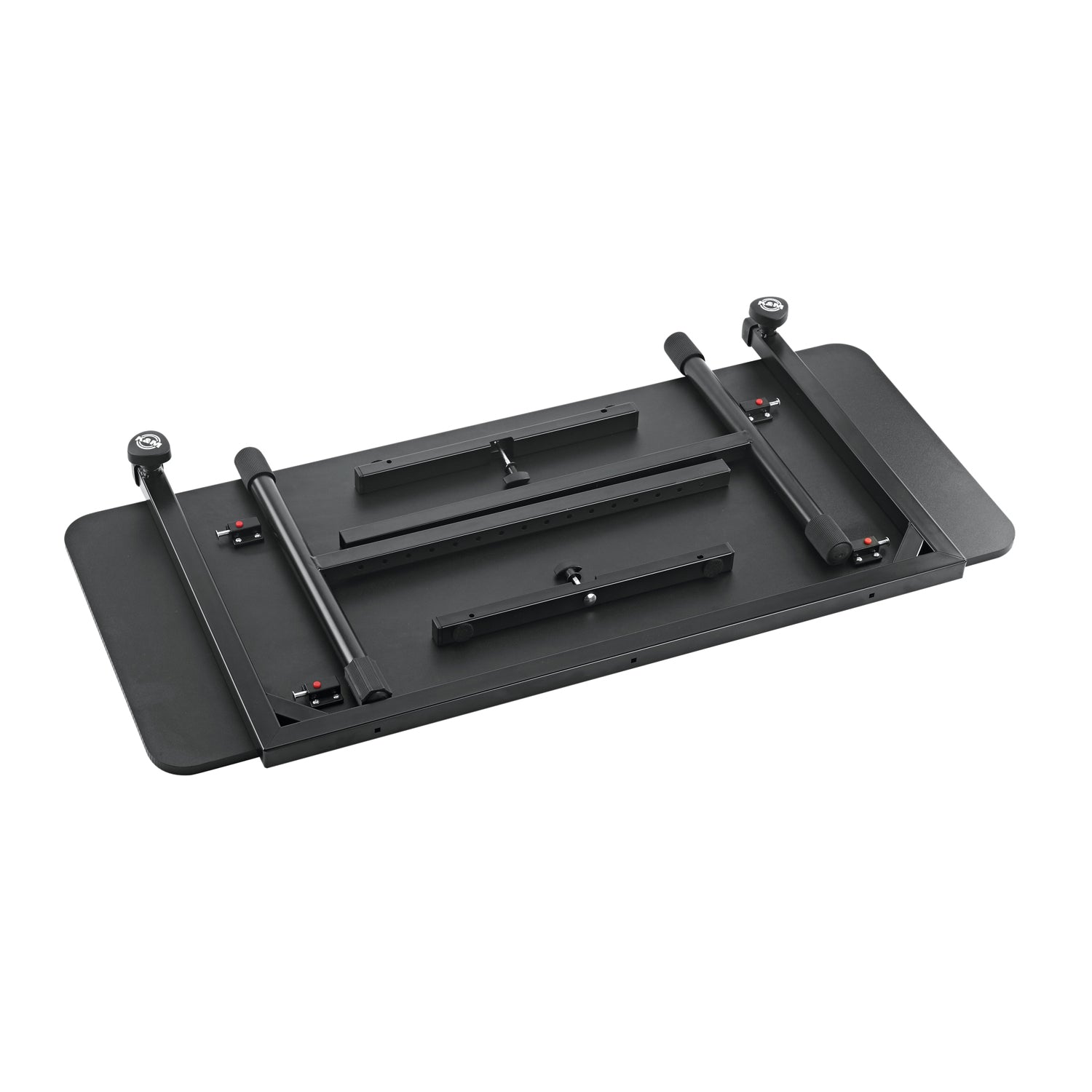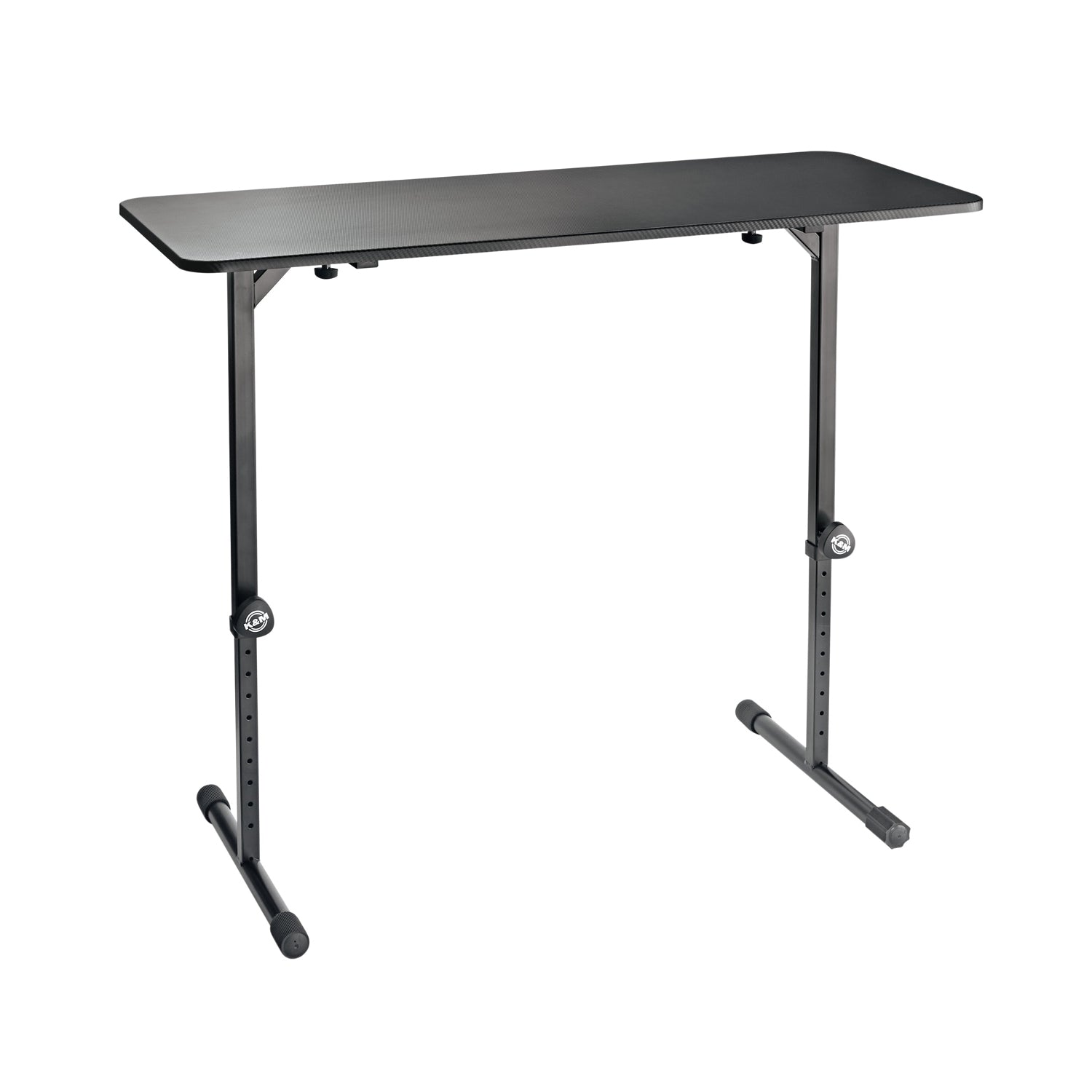 König & Meyer 12160 DJ desk – tai stabilus ir funkcionalus stalas, sukurtas specialiai DJ įrangai ir studijiniams įrenginiams. Jo erdvi 1100 x 455 mm stalviršio plokštė suteikia pakankamai vietos mikšeriams, grotuvams, nešiojamiems kompiuteriams (ir kontroleriams). Dėl keturių greito fiksavimo spaustukų („quick-release clamps“), stalviršį galima sumontuoti arba nuimti akimirksniu, todėl stalas idealiai tinka mobiliam naudojimui.