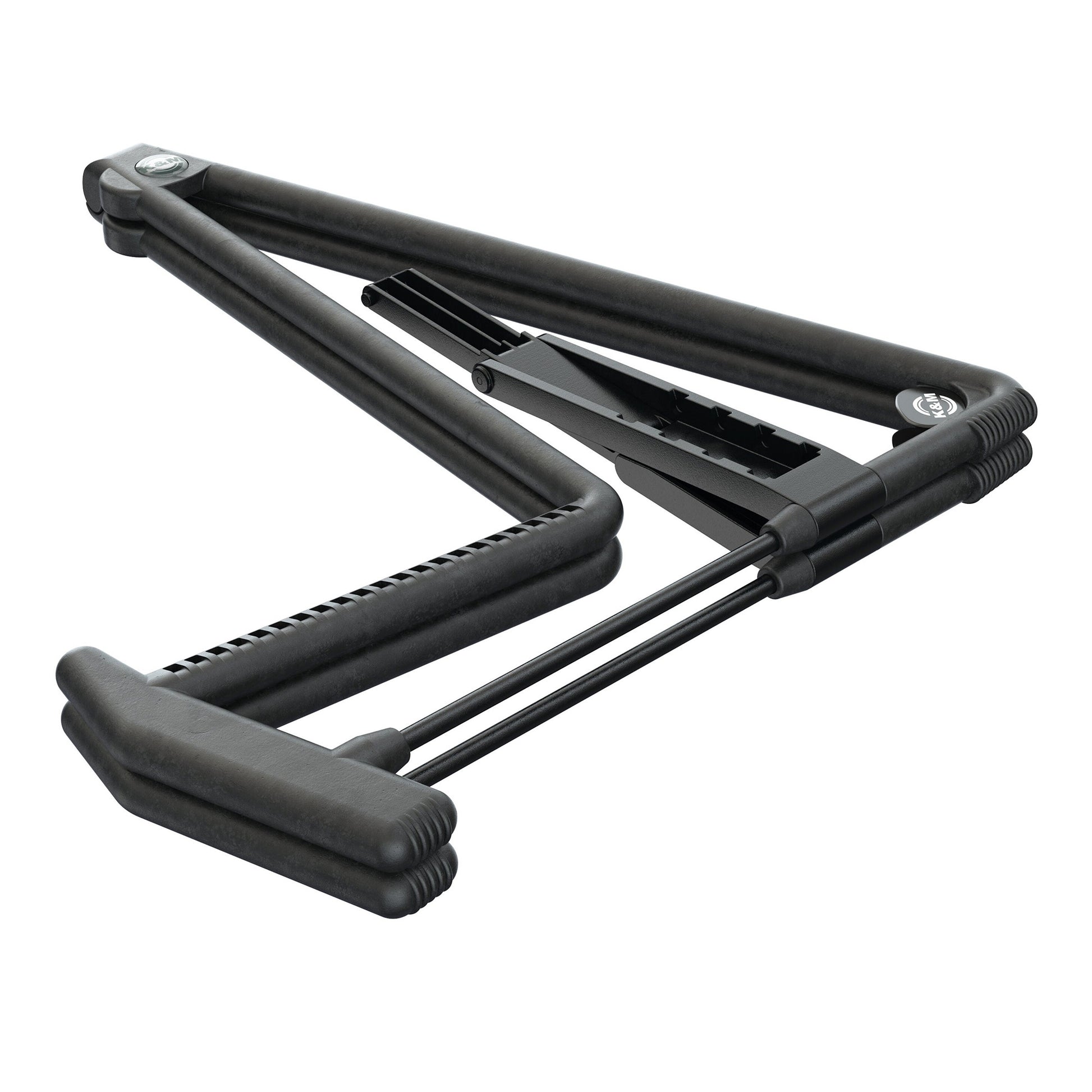 König & Meyer 17580 A-Guitar Stand »Heli 2« (Black) – tai visame pasaulyje pripažintas, profesionalus stovas akustinėms gitaroms. Atnaujintas „Heli 2“ modelis pasižymi inovatyvia reguliuojama konstrukcija: keičiant skersinio plotį (nuo 185 iki 230 mm), stovą galima pritaikyti ne tik įvairių dydžių akustinėms gitaroms, bet ir violončelėms ar valtornoms („French horn“). Tai universalus sprendimas muzikantams, ieškantiems vieno stovo keliems instrumentams.