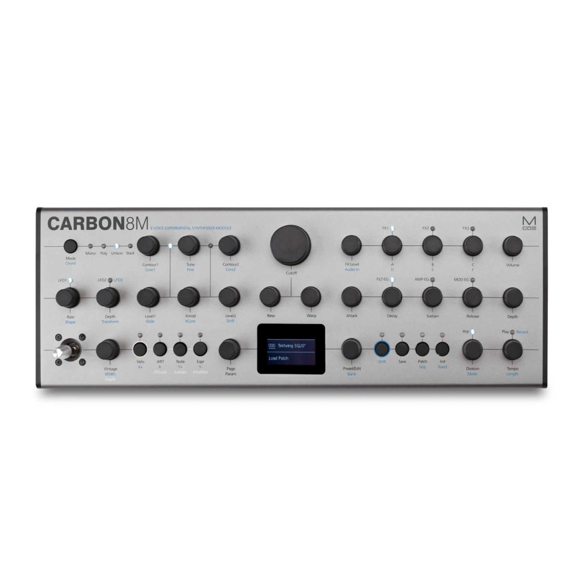 Modal Electronics Carbon8M – tai kompaktiškas, tačiau galingas sintezatorius, talpinantis visą revoliucinę „Carbon8“ garso generavimo sistemą mažesniame formate. Tai idealus sprendimas prodiuseriams, turintiems ribotą vietą studijoje, arba tiems, kurie nori integruoti galingą 8 balsų eksperimentinę skaitmeninę sintezę į savo 19 colių „rack“ sistemą. Modulis naudoja tuos pačius du osciliatorius su 56 branduoliais, kuriančius unikalius algoritmus ir bangų lenteles (wavetables).